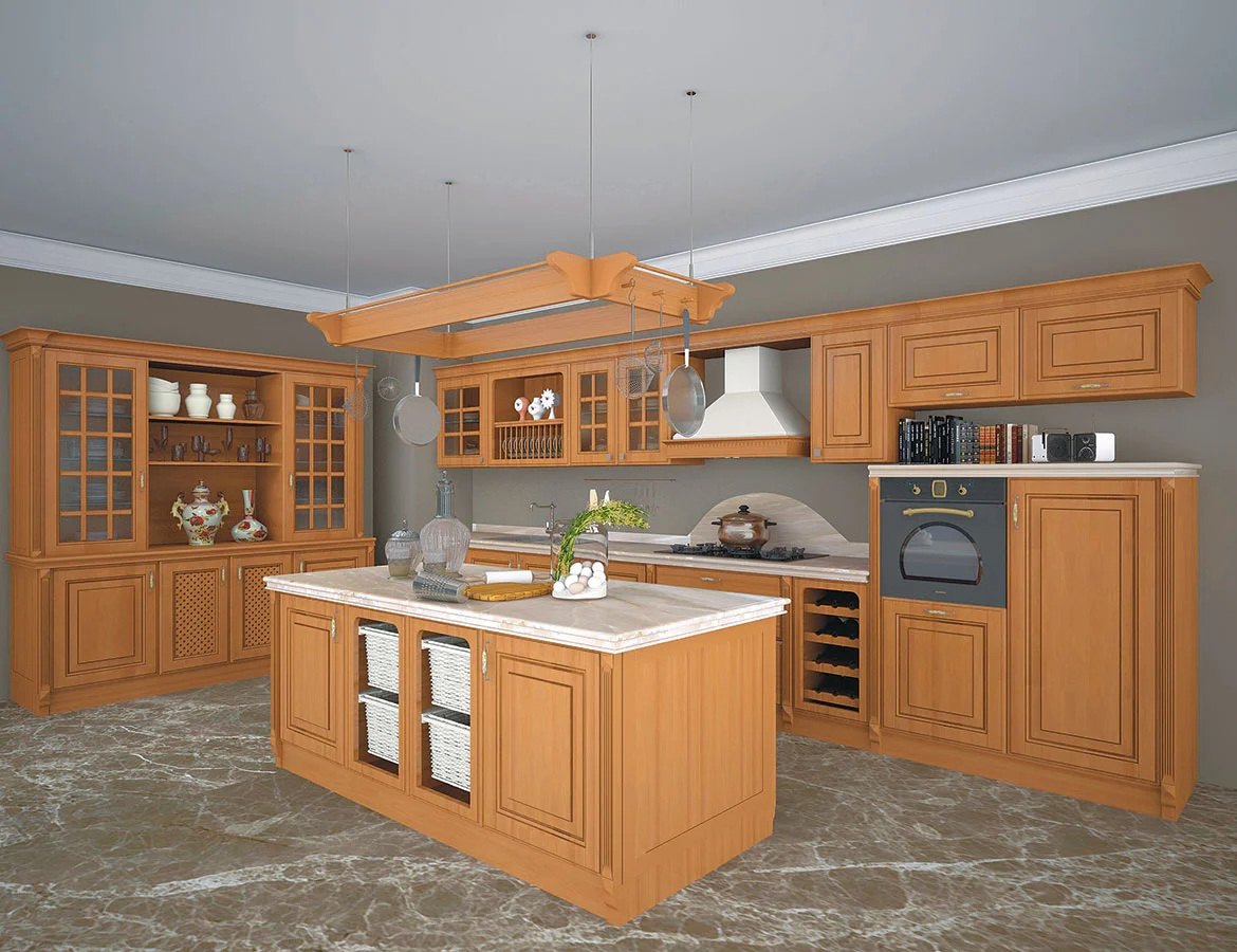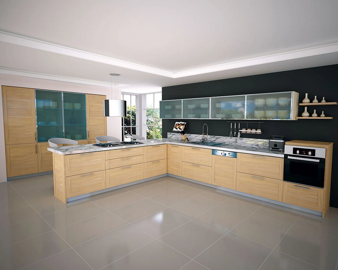 Geleneksel çizgilere sahip çerçeve kapak modelini, alüminyum çerçeveli cam kapaklarla bütünleşmesi, boy dolapların niş içine gizlenmesi, ve yarım ada modeliyle Laris geleneksel ve modern çizgileri bir arada tercih edenler için.